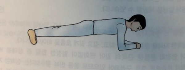 - 동작 : 머리부터 발끝까지 일직선이 되게 유지한 채 몸을 바닥에서 들어 올리고 아래팔과 발끝으로 버팁니다. 턱을 당기고 등을 평편하게 유지한 채로 30초 이상 진행하는 것이 좋습니다.