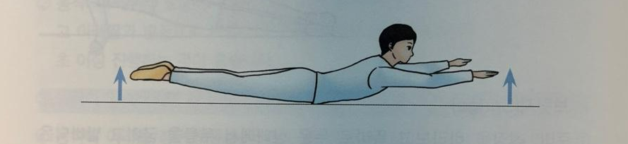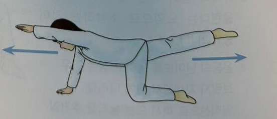 - 동작 : 이 상태에서 다른 쪽 팔과 다리를 앞뒤로 상체 높이만큼 들어올려 유지합니다.