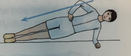 - 동작 : 머리부터 발끝까지 일직선이 되게 유지한 채 몸 전체를 바닥에서 들어올려 한쪽 아래팔과 발로 버티면서 옆으로 보는 자세를 유지합니다. 목, 허리, 고관절이 굽혀지지 않고 펴진 상태를 유지해야 합니다.