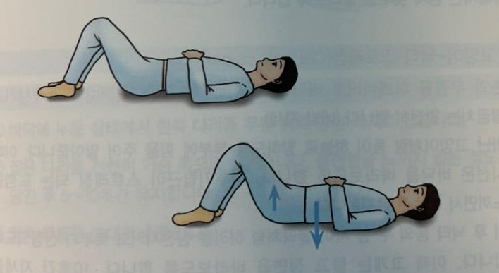- 준비 : 바닥에 등을 대고 누워 무릎을 구부리고 발을 바닥에 고정합니다. 양손은 가슴 위에 올립니다.