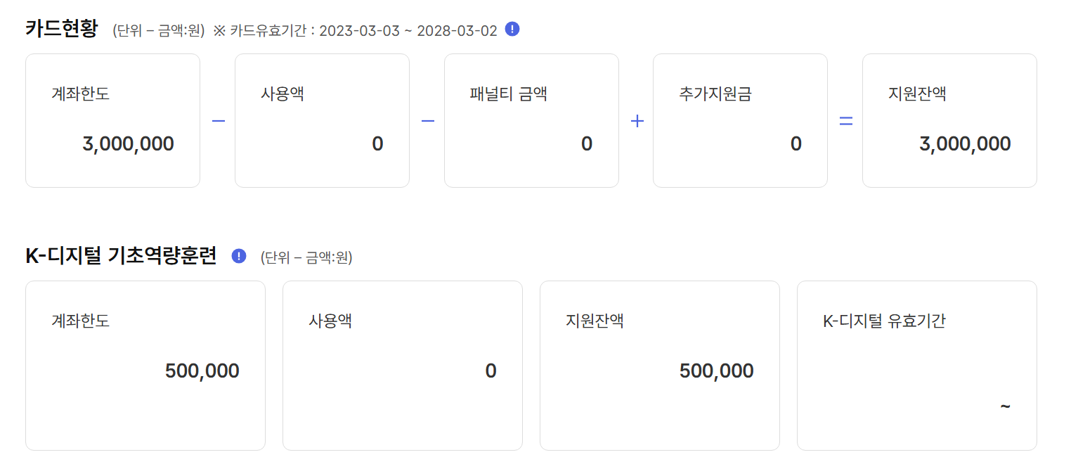 · 훈련비 지원액: 5년간 300만원+ 200만원 추가 지원※ 카드의 유효기간은 5년입니다.